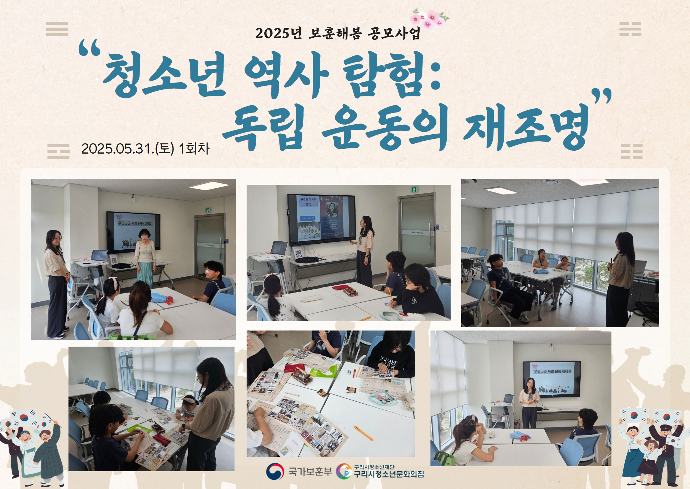 청소년문화의집 보훈부 공모사업 '청소년 역사탐험' 초등부 1기 - 1회차(2025.05.31) 작성자 김윤지 등록일자 2025년 6월 14일 14시 3분 42초 조회 76 국가보훈부 공모사업 '청소년 역사탐험: 독립 운동의 재조명'초등부 1기 1회차 - 역사 이론 수업(10시~13시 총 3시간) 활동기록(공모사업) 1.jpg [ Size : 3.27MB , Down : 50 ] 미리보기 다운로드 목록보기