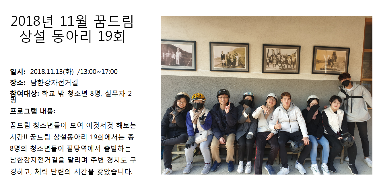 청소년상담복지센터 2018년 11월 상설동아리 19회 작성자 관리자 등록일자 2018년 12월 7일 13시 10분 8초 조회 302 1544155935_photo_table.png [ Size : 952.17KB , Down : 110 ] 미리보기 다운로드 목록보기