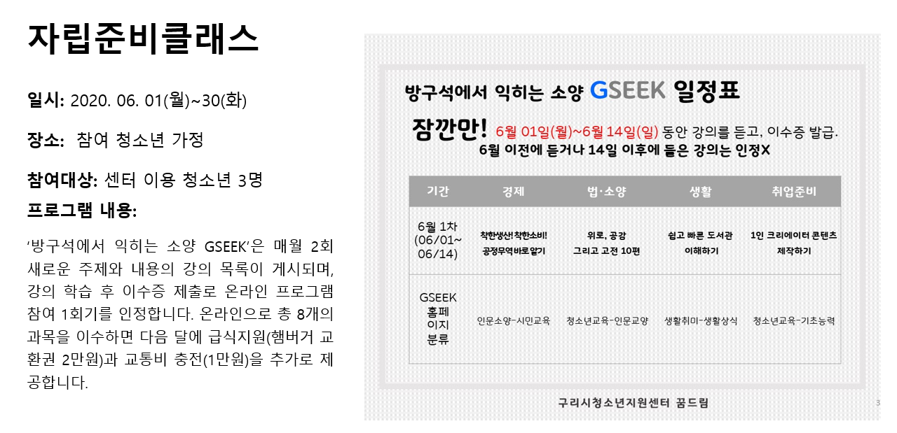 청소년상담복지센터 2020년 6월 자립준비클래스 작성자 관리자 등록일자 2020년 7월 3일 11시 13분 22초 조회 304 1593742402_photo_table.png [ Size : 332.35KB , Down : 113 ] 미리보기 다운로드 목록보기
