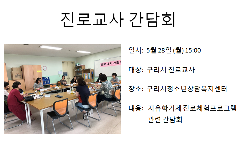 청소년상담복지센터 진로교사 간담회 작성자 관리자 등록일자 2018년 6월 7일 9시 52분 37초 조회 363 1528332757_photo_table.png [ Size : 297.23KB , Down : 120 ] 미리보기 다운로드 목록보기
