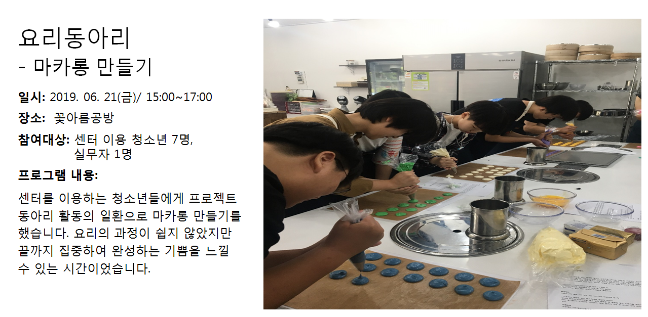 청소년상담복지센터 2019년 6월 요리동아리 - 마카롱만들기 작성자 관리자 등록일자 2019년 7월 3일 11시 16분 57초 조회 282 1562120217_photo_table.png [ Size : 851.64KB , Down : 103 ] 미리보기 다운로드 목록보기