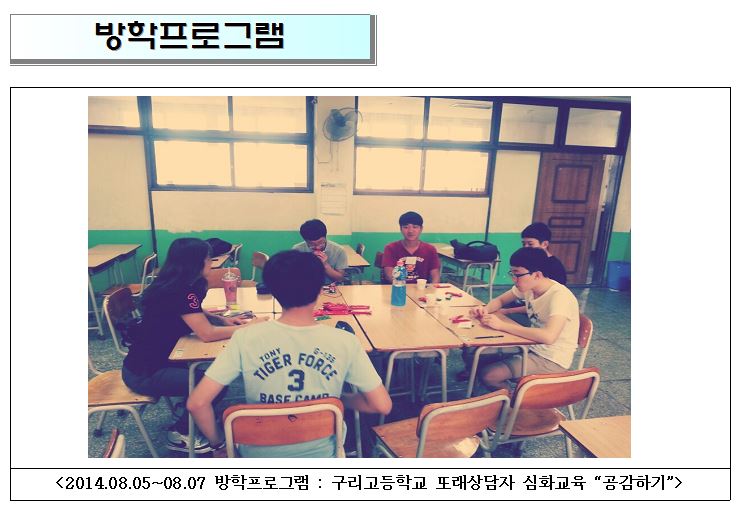 청소년상담복지센터 2014년 또래상담자 방학 프로그램 작성자 관리자 등록일자 2014년 12월 31일 10시 15분 46초 조회 471 1419988546_photo_table.jpg [ Size : 70.39KB , Down : 95 ] 미리보기 다운로드 목록보기