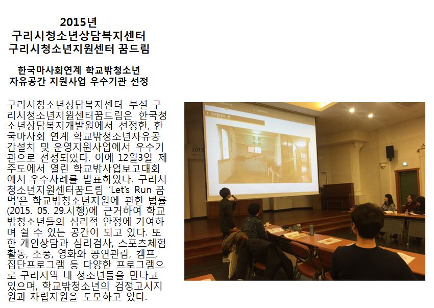 청소년상담복지센터 [꿈드림]한국마사회연계 자유공간 지원사업 우수기관 선정 작성자 관리자 등록일자 2015년 12월 10일 17시 53분 24초 조회 662 1449737604_photo_table.jpg [ Size : 114.39KB , Down : 108 ] 미리보기 다운로드 목록보기