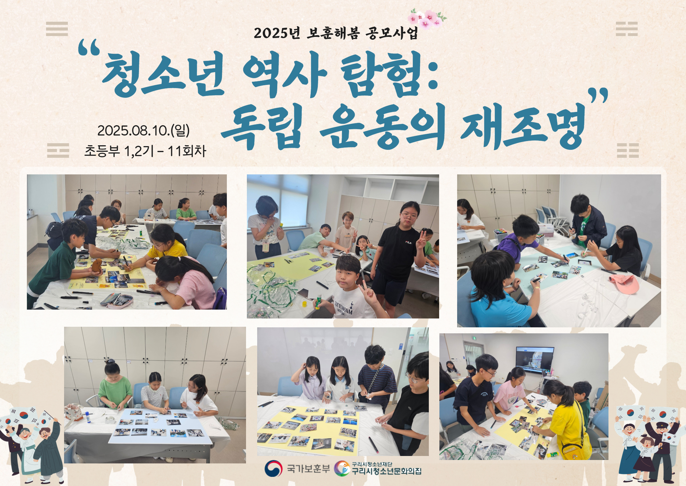 청소년문화의집 보훈부 공모사업 '청소년 역사탐험' 초등부 1,2기 - 11회차(2025.08.10) 작성자 김윤지 등록일자 2025년 8월 10일 14시 25분 33초 조회 88 국가보훈부 공모사업 '청소년 역사탐험: 독립 운동의 재조명'초등부 1,2기 11회차 - 낭독회 및 출판기념회 준비(10시~12시 총 2시간) 활동기록(공모사업) (4).jpg [ Size : 3.33MB , Down : 47 ] 미리보기 다운로드 목록보기