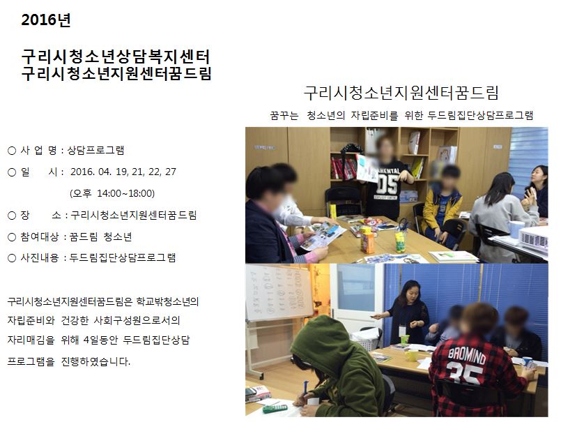 청소년상담복지센터 [꿈드림]두드림 집단상담 프로그램 작성자 관리자 등록일자 2016년 5월 3일 14시 29분 1초 조회 446 1462253341_photo_table.jpg [ Size : 88.08KB , Down : 116 ] 미리보기 다운로드 목록보기
