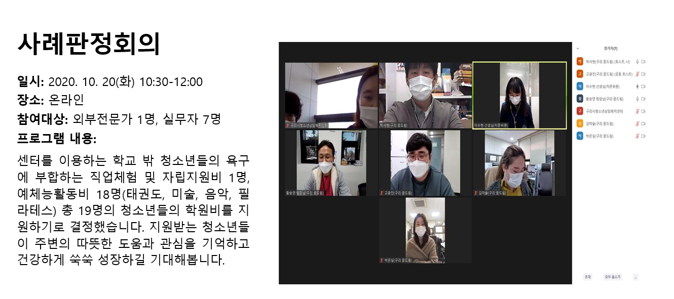 청소년상담복지센터 2020년 10월 사례판정회의 작성자 관리자 등록일자 2020년 11월 10일 11시 54분 9초 조회 308 1604976849_photo_table.png [ Size : 403.98KB , Down : 130 ] 미리보기 다운로드 목록보기