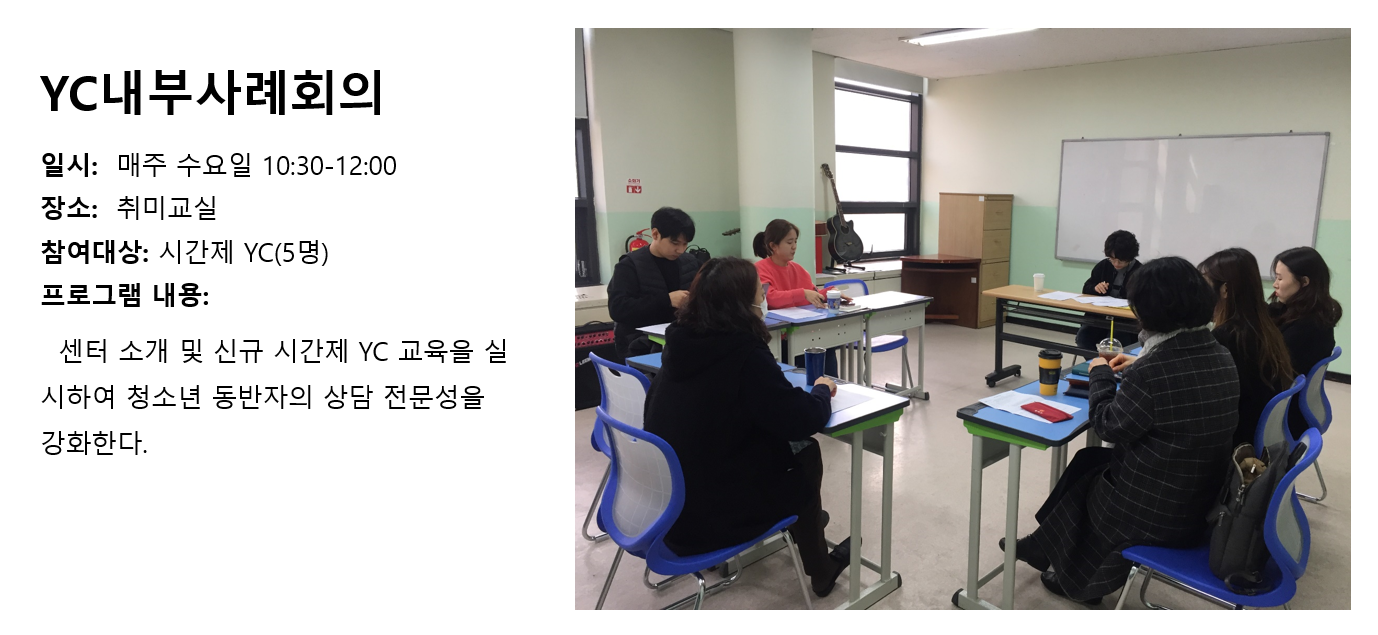 청소년상담복지센터 1월 YC 내부사례회의 작성자 관리자 등록일자 2020년 3월 4일 17시 4분 47초 조회 288 1583309087_photo_table.png [ Size : 839.74KB , Down : 115 ] 미리보기 다운로드 목록보기