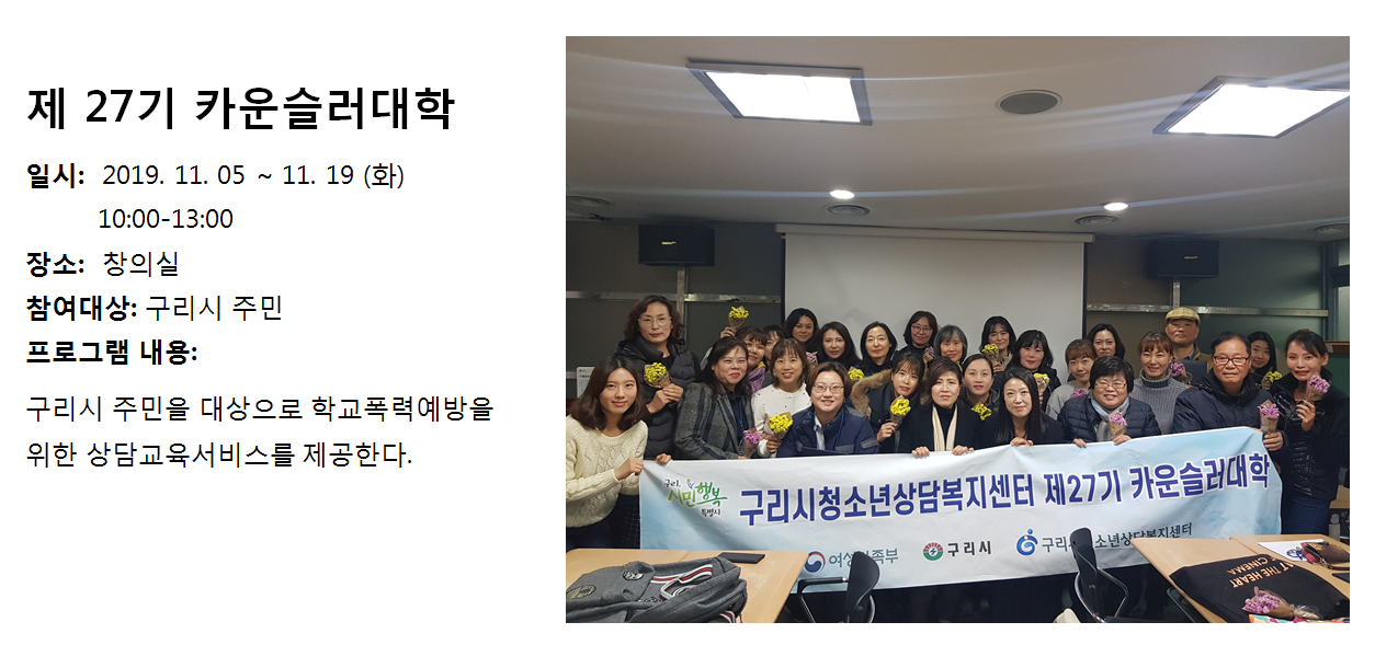 청소년상담복지센터 2019년 제27기 카운슬러대학 작성자 관리자 등록일자 2019년 12월 4일 11시 45분 46초 조회 305 1575427546_photo_table.png [ Size : 761.67KB , Down : 134 ] 미리보기 다운로드 목록보기