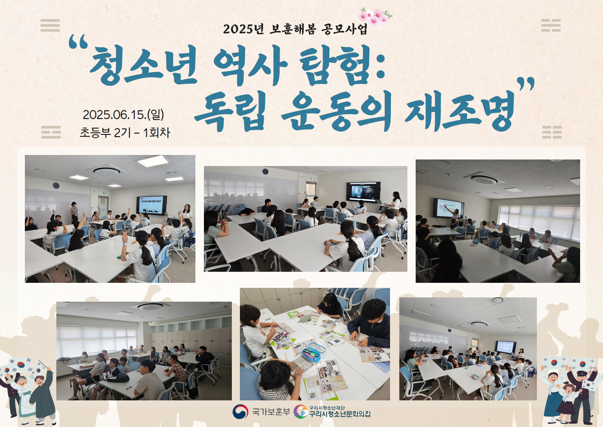 청소년문화의집 보훈부 공모사업 '청소년 역사탐험' 초등부 2기 - 1회차(2025.06.15) 작성자 김윤지 등록일자 2025년 6월 17일 17시 3분 31초 조회 128 국가보훈부 공모사업 '청소년 역사탐험: 독립 운동의 재조명'초등부 2기 1회차 - 역사 이론 수업(10시~13시 총 3시간) 활동기록(공모사업).jpg [ Size : 3.38MB , Down : 55 ] 미리보기 다운로드 목록보기