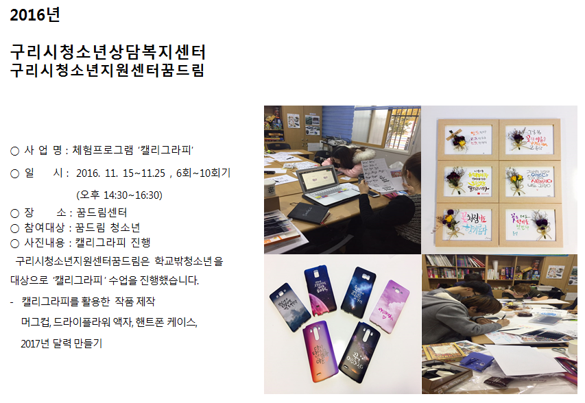 청소년상담복지센터 [꿈드림] 체험프로그램 '캘리그라피' 2 작성자 관리자 등록일자 2016년 12월 14일 12시 7분 19초 조회 849 내용없음 1481684839_photo_table.png [ Size : 493.58KB , Down : 109 ] 미리보기 다운로드 목록보기