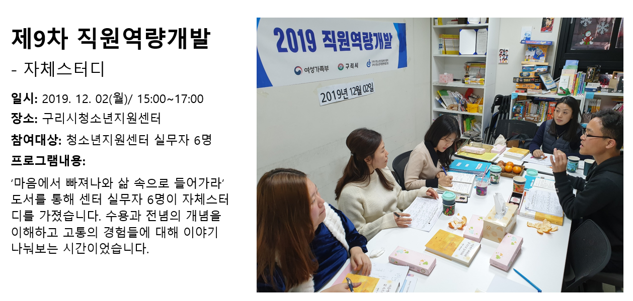 청소년상담복지센터 2019년 12월 제9차 직원역량개발 - 자체스터디 작성자 관리자 등록일자 2020년 1월 6일 14시 29분 25초 조회 321 1578288565_photo_table.png [ Size : 830.68KB , Down : 117 ] 미리보기 다운로드 목록보기