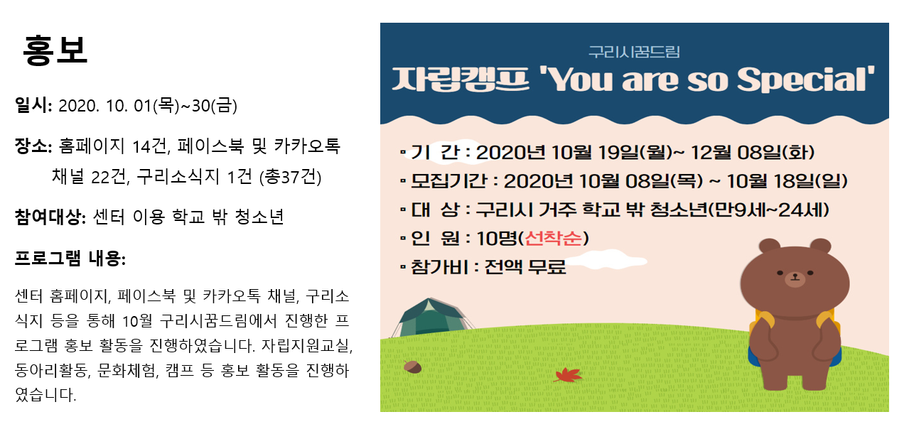 청소년상담복지센터 2020년 10월 홍보 작성자 관리자 등록일자 2020년 11월 10일 11시 54분 25초 조회 317 1604976865_photo_table.png [ Size : 384.66KB , Down : 131 ] 미리보기 다운로드 목록보기