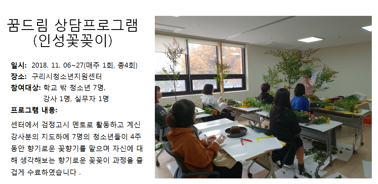 청소년상담복지센터 2018년 11월 상담프로그램 (인성꽃꽂이) 작성자 관리자 등록일자 2018년 12월 7일 13시 8분 41초 조회 358 1544155721_photo_table.png [ Size : 840.92KB , Down : 102 ] 미리보기 다운로드 목록보기