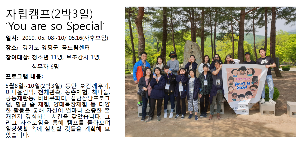 청소년상담복지센터 2019년 자립캠프 'you are so special' 작성자 관리자 등록일자 2019년 6월 4일 14시 8분 0초 조회 281 1559624880_photo_table.png [ Size : 1.06MB , Down : 121 ] 미리보기 다운로드 목록보기