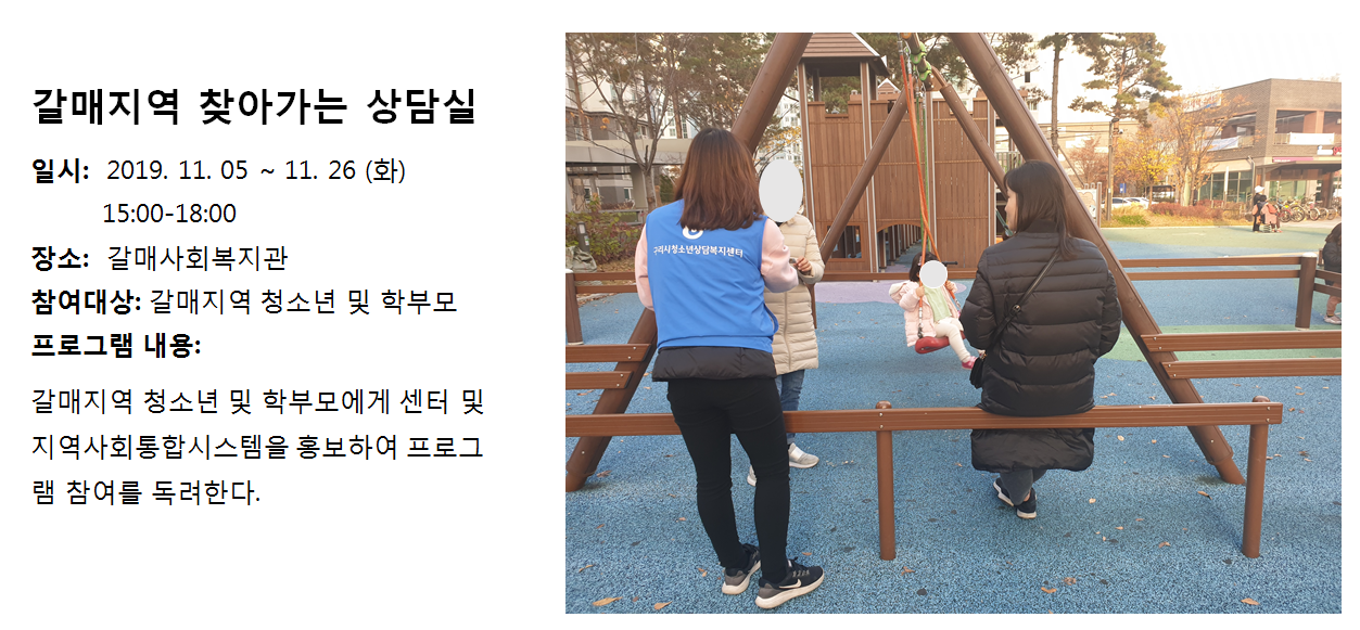 청소년상담복지센터 2019년 11월 갈매지역 찾아가는 상담실 작성자 관리자 등록일자 2019년 12월 4일 11시 46분 40초 조회 315 1575427600_photo_table.png [ Size : 942.26KB , Down : 103 ] 미리보기 다운로드 목록보기