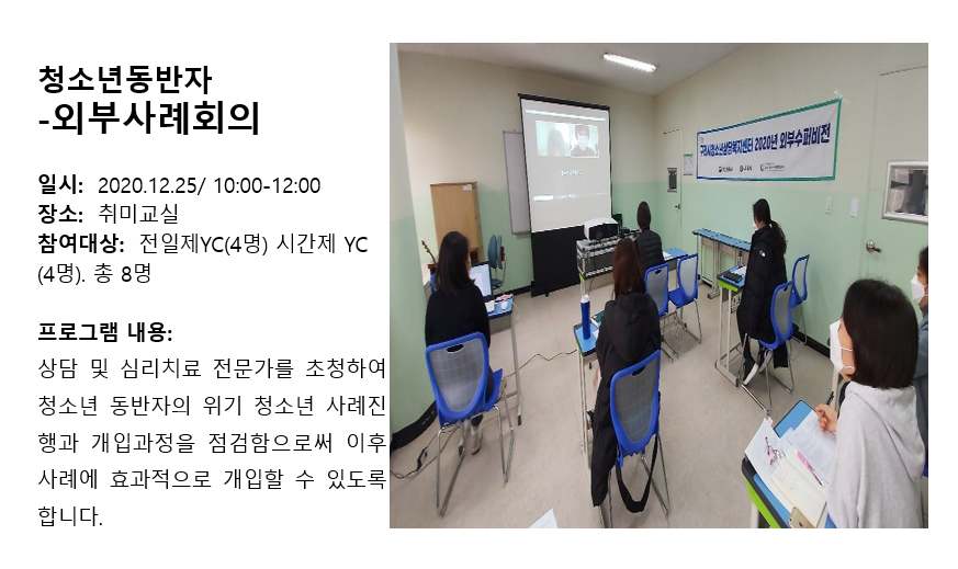 청소년상담복지센터 2020년 11월 외부사례회의 작성자 관리자 등록일자 2020년 12월 4일 11시 27분 20초 조회 395 1607048840_photo_table.png [ Size : 461.51KB , Down : 131 ] 미리보기 다운로드 목록보기
