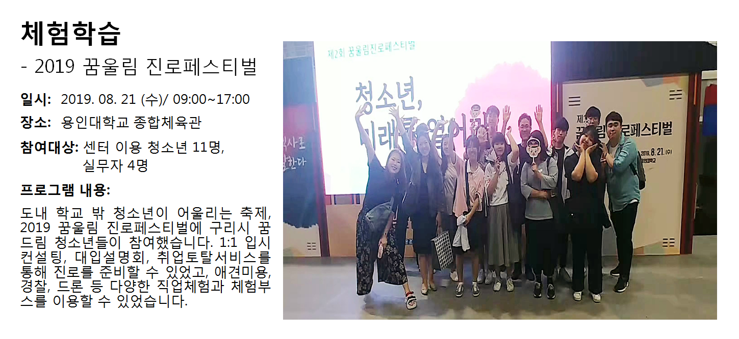 청소년상담복지센터 2019년 8월 체험학습 - 꿈울림 진로페스티벌 작성자 관리자 등록일자 2019년 9월 3일 9시 43분 45초 조회 301 1567471425_photo_table.png [ Size : 806.62KB , Down : 120 ] 미리보기 다운로드 목록보기