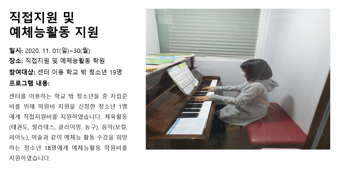 청소년상담복지센터 2020년 11월 직접지원 및 예체능활동 지원 작성자 관리자 등록일자 2020년 12월 4일 11시 14분 41초 조회 398 1607048081_photo_table.png [ Size : 648.96KB , Down : 136 ] 미리보기 다운로드 목록보기