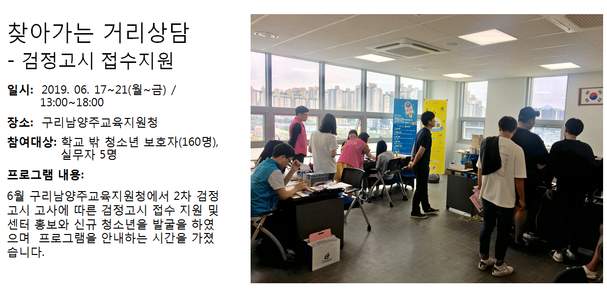 청소년상담복지센터 2019년 6월 찾아가는거리상담 - 검정고시접수지원 작성자 관리자 등록일자 2019년 7월 3일 11시 17분 48초 조회 277 1562120268_photo_table.png [ Size : 887.3KB , Down : 101 ] 미리보기 다운로드 목록보기