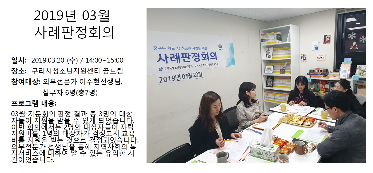 청소년상담복지센터 2019년 3월 사례판정회의 작성자 관리자 등록일자 2019년 4월 4일 11시 1분 17초 조회 293 1554343277_photo_table.jpg [ Size : 493.89KB , Down : 103 ] 미리보기 다운로드 목록보기