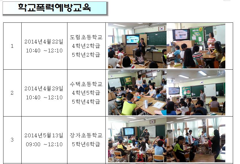 청소년상담복지센터 2014년 학교폭력예방교육 작성자 관리자 등록일자 2014년 12월 31일 10시 19분 59초 조회 535 1419988799_photo_table.jpg [ Size : 110.52KB , Down : 107 ] 미리보기 다운로드 목록보기