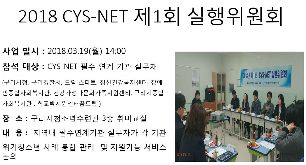 청소년상담복지센터 2018년 CYS-NET 제1회 실행위원회 작성자 관리자 등록일자 2018년 3월 28일 13시 33분 27초 조회 363 1522212395_photo_table.jpg [ Size : 102.18KB , Down : 113 ] 미리보기 다운로드 목록보기