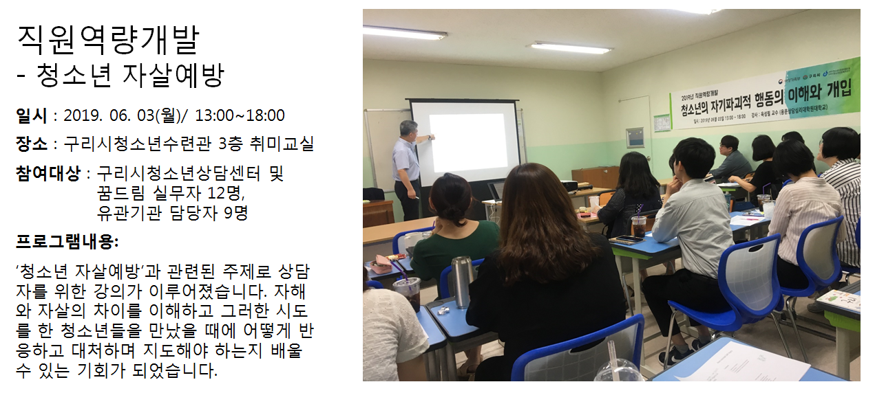 청소년상담복지센터 2019년 6월 직원역량개발 - 청소년자살예방 작성자 관리자 등록일자 2019년 7월 3일 11시 20분 2초 조회 287 1562120402_photo_table.png [ Size : 790.21KB , Down : 125 ] 미리보기 다운로드 목록보기
