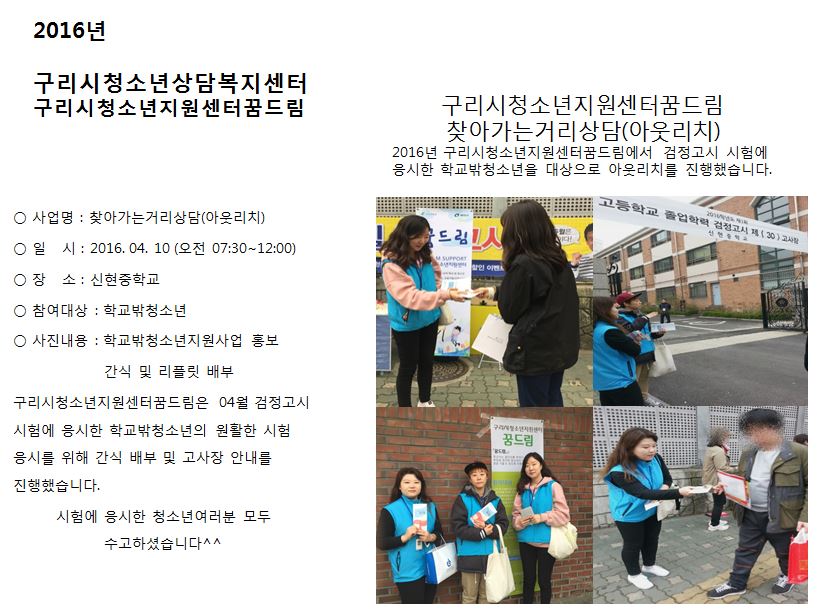 청소년상담복지센터 [꿈드림] 찾아가는거리상담 (검정고시 고사장) 작성자 관리자 등록일자 2016년 4월 14일 11시 2분 16초 조회 467 1460599336_photo_table.jpg [ Size : 107.13KB , Down : 92 ] 미리보기 다운로드 목록보기