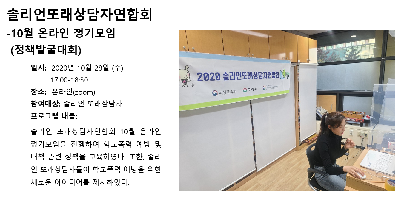 청소년상담복지센터 2020년 10월 솔리언또래상담자연합회 - 정책발굴대회 작성자 관리자 등록일자 2020년 11월 4일 11시 4분 9초 조회 388 1604455449_photo_table.png [ Size : 768.1KB , Down : 143 ] 미리보기 다운로드 목록보기