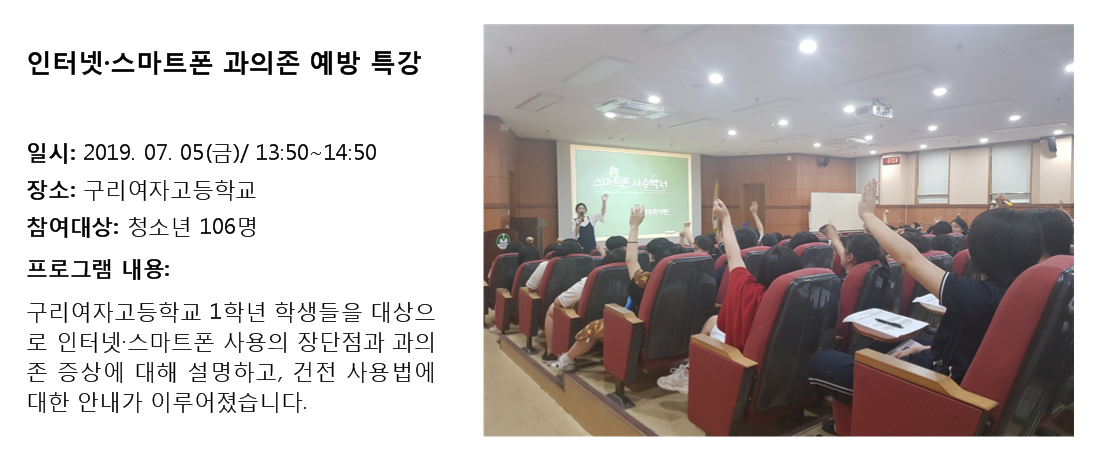 청소년상담복지센터 2019년 7월 청소년 인터넷.스마트폰 과의존 예방 특강 작성자 관리자 등록일자 2019년 8월 5일 17시 18분 3초 조회 331 1564993083_photo_table.png [ Size : 471.24KB , Down : 96 ] 미리보기 다운로드 목록보기