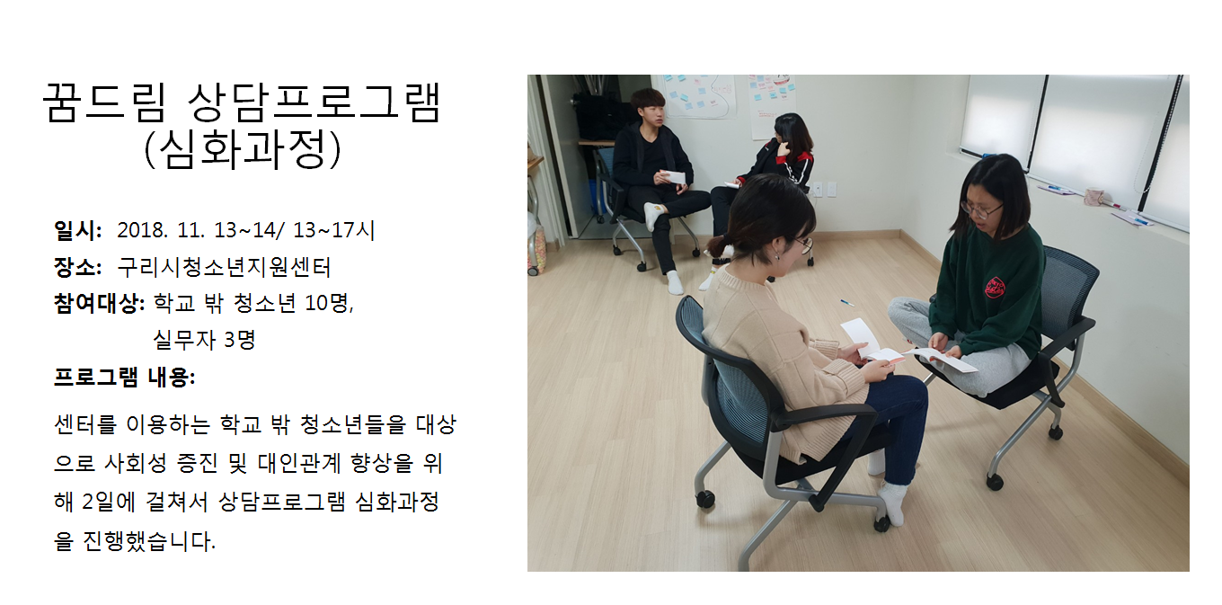 청소년상담복지센터 2018년 11월 상담프로그램 (심화과정) 작성자 관리자 등록일자 2018년 12월 7일 13시 9분 13초 조회 311 1544155753_photo_table.png [ Size : 731.45KB , Down : 109 ] 미리보기 다운로드 목록보기