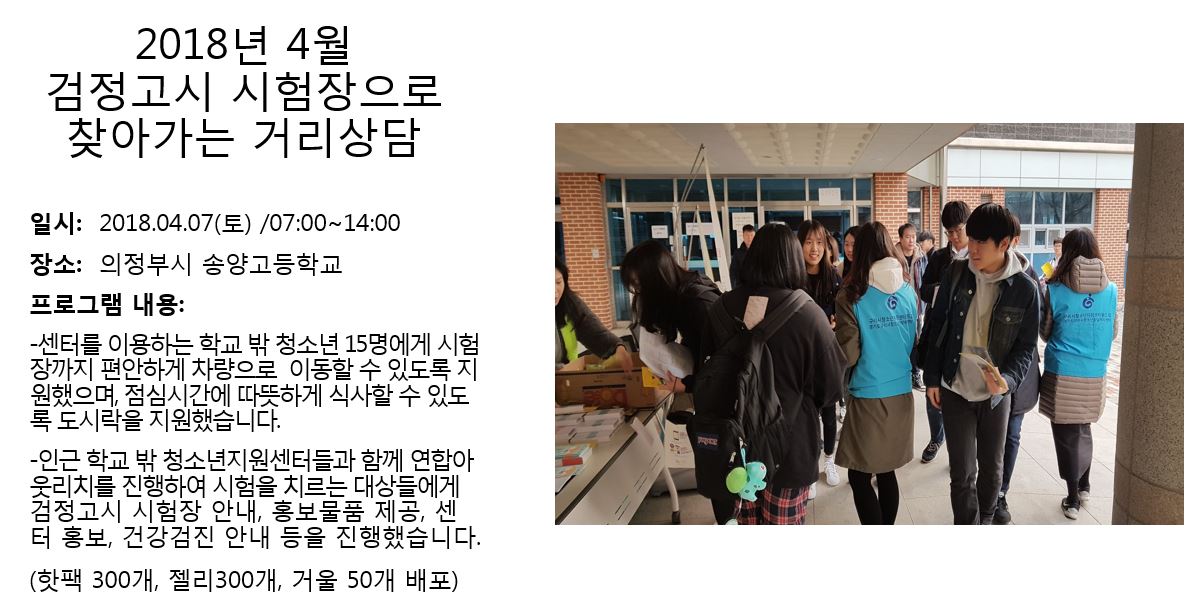 청소년상담복지센터 2018년 4월 검정고시시험장으로 찾아가는 거리상담 작성자 관리자 등록일자 2018년 5월 2일 18시 4분 19초 조회 329 1525251859_photo_table.jpg [ Size : 137.31KB , Down : 130 ] 미리보기 다운로드 목록보기