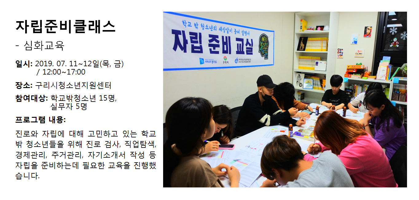 청소년상담복지센터 2019년 7월 자립준비클래스 - 심화교육 작성자 관리자 등록일자 2019년 8월 1일 14시 51분 7초 조회 374 1564638667_photo_table.png [ Size : 1.06MB , Down : 108 ] 미리보기 다운로드 목록보기