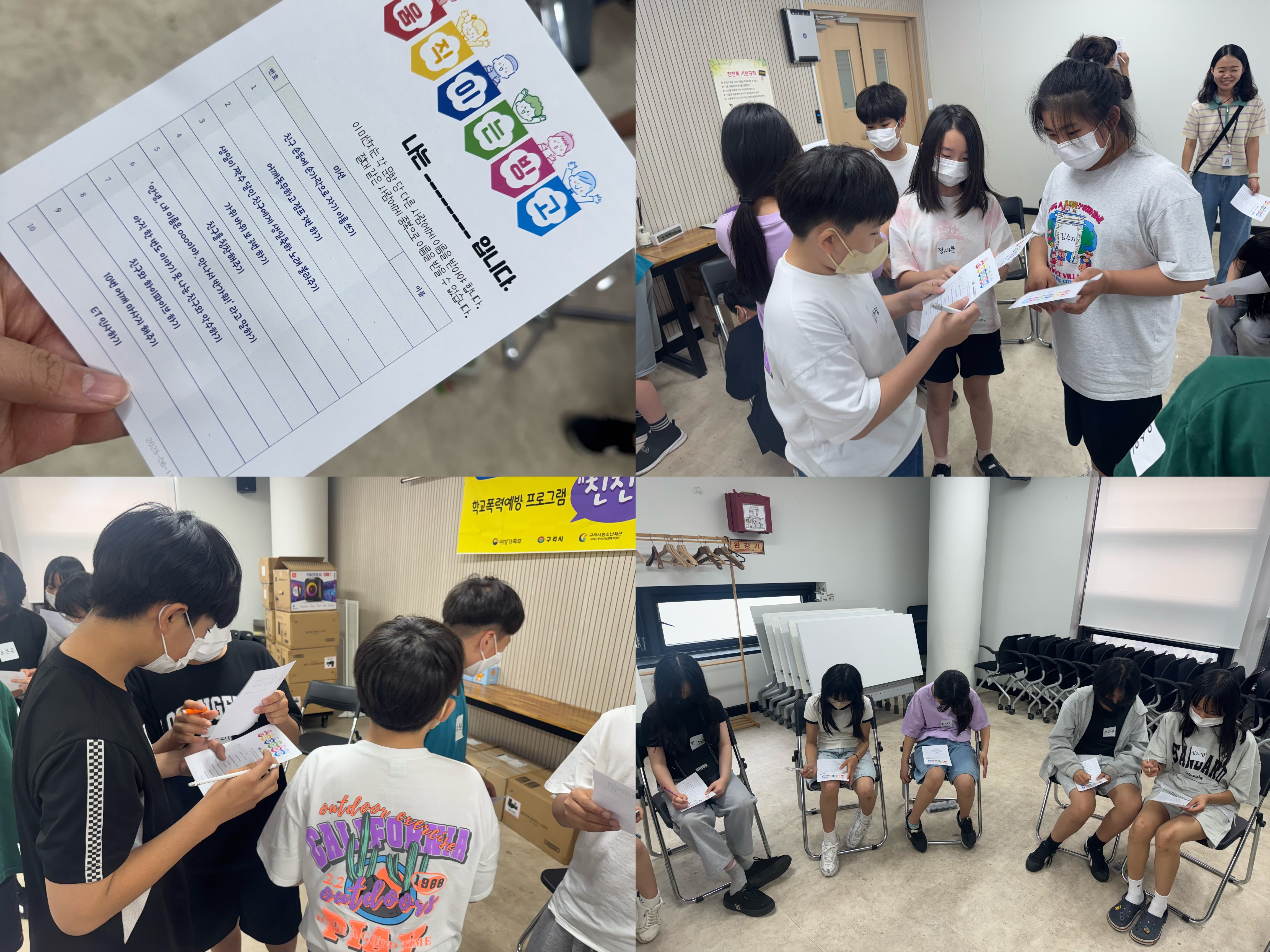 안녕하세요 늘푸름방과후아카데미입니다. 상담복지센터와 연계한 친친톡 활동을 오늘부터 총 6회기 진행할 예정입니다. 매주 금요일에 수업이 시작되고 참가 청소년들과 다양한 게임과 활동을 통해 청소년들의 스트레스 및 심리를 안정시켜줄수있도록 도움을 받고자 합니다!~^^ 1회기 활동으로는 바람이불어와 게임과 움직이는 빙고게임을 하였습니다!~^^