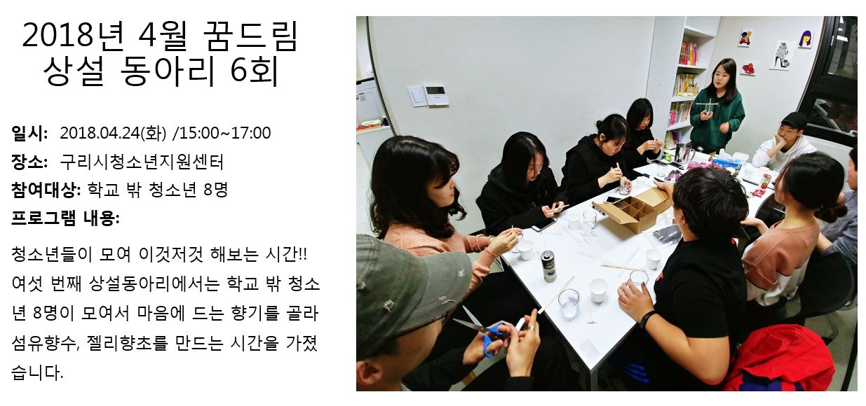 청소년상담복지센터 2018년 4월 꿈드림 상설동아리 6회 작성자 관리자 등록일자 2018년 5월 2일 18시 3분 19초 조회 338 1525251799_photo_table.jpg [ Size : 123.4KB , Down : 125 ] 미리보기 다운로드 목록보기