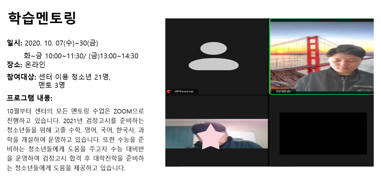 청소년상담복지센터 2020년 10월 학습멘토링 작성자 관리자 등록일자 2020년 11월 10일 11시 53분 2초 조회 321 1604976782_photo_table.png [ Size : 297.65KB , Down : 123 ] 미리보기 다운로드 목록보기