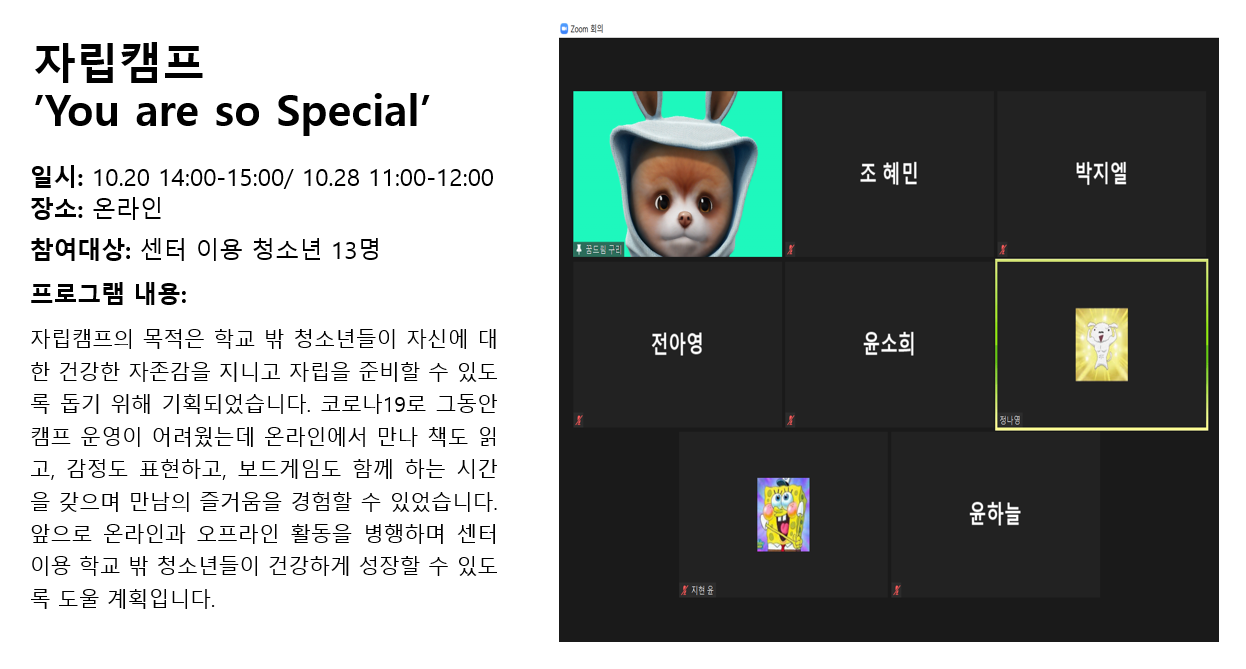 청소년상담복지센터 2020년 10월 자립캠프 you are so special 작성자 관리자 등록일자 2020년 11월 10일 11시 50분 24초 조회 270 1604976624_photo_table.png [ Size : 151.19KB , Down : 136 ] 미리보기 다운로드 목록보기