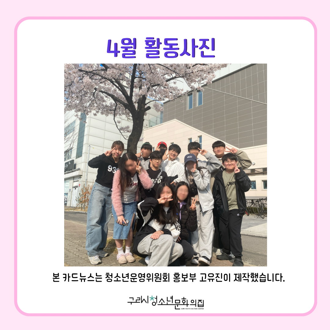 청소년문화의집 청소년운영위원회 '별하' 4월 활동사진 작성자 김진수 등록일자 2024년 4월 8일 15시 12분 11초 조회 369 본 게시물은 청소년운영위원회 고o진 위원님(청소년)이직접 제작한 카드뉴스 입니다:) 1.png [ Size : 1.54MB , Down : 118 ] 미리보기 다운로드 2.png [ Size : 1.52MB , Down : 115 ] 미리보기 다운로드 3.png [ Size : 1.51MB , Down : 111 ] 미리보기 다운로드 4.png [ Size : 670.34KB , Down : 114 ] 미리보기 다운로드 5.png [ Size : 1.51MB , Down : 108 ] 미리보기 다운로드 목록보기