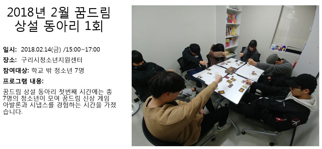 청소년상담복지센터 2018년 2월 꿈드림 상설 동아리 1회 작성자 관리자 등록일자 2018년 3월 5일 13시 32분 18초 조회 368 1520224338_photo_table.jpg [ Size : 80.62KB , Down : 161 ] 미리보기 다운로드 목록보기