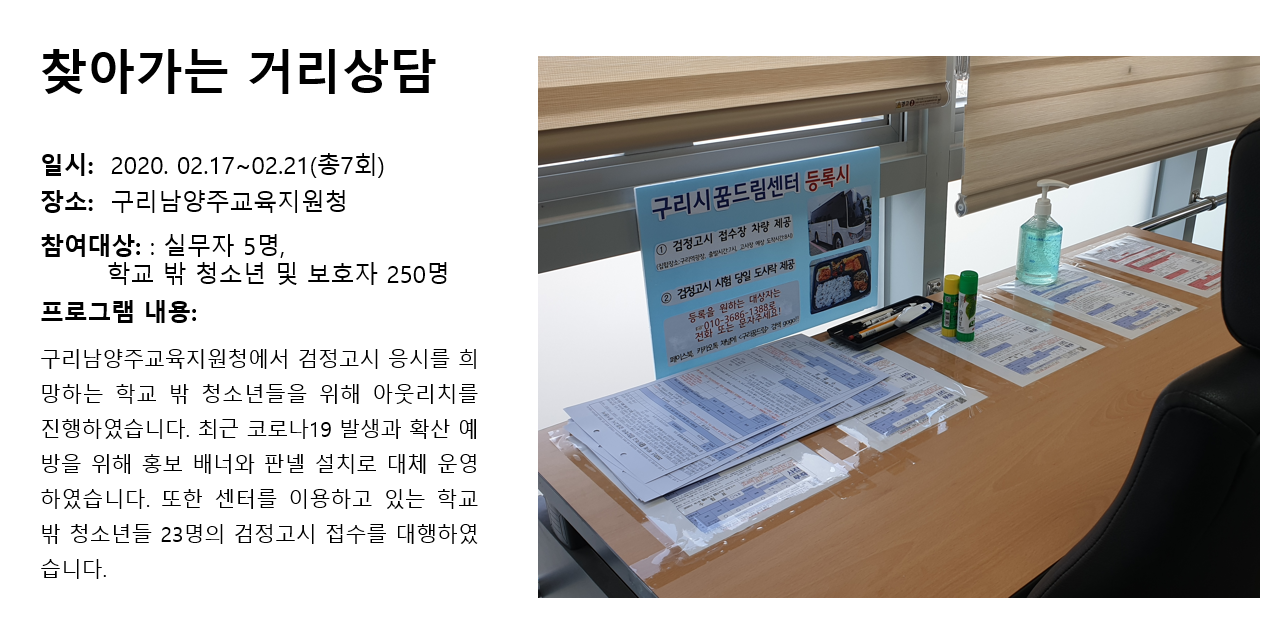 청소년상담복지센터 2020년 2월 찾아가는 거리상담 작성자 관리자 등록일자 2020년 3월 3일 9시 38분 10초 조회 339 1583195890_photo_table.png [ Size : 702.08KB , Down : 129 ] 미리보기 다운로드 목록보기