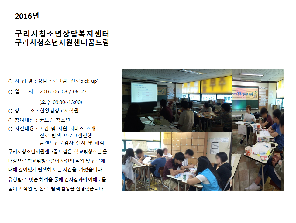 청소년상담복지센터 [꿈드림] 상담프로그램 '진로 pick up' 작성자 관리자 등록일자 2016년 6월 24일 16시 57분 15초 조회 559 내용없음 1466755035_photo_table.png [ Size : 628.96KB , Down : 103 ] 미리보기 다운로드 목록보기