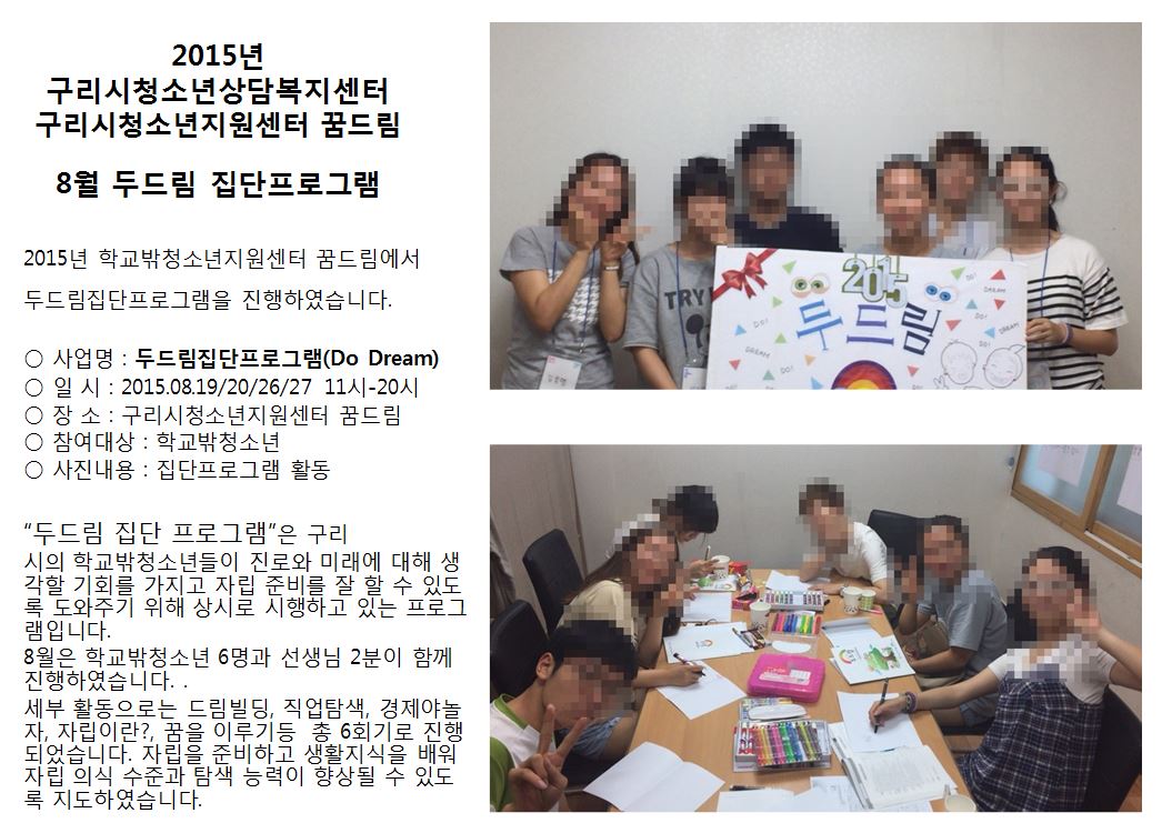 청소년상담복지센터 [꿈드림] 두드림 집단프로그램 작성자 관리자 등록일자 2015년 9월 3일 11시 41분 54초 조회 530 1441248114_photo_table.jpg [ Size : 159.89KB , Down : 107 ] 미리보기 다운로드 목록보기