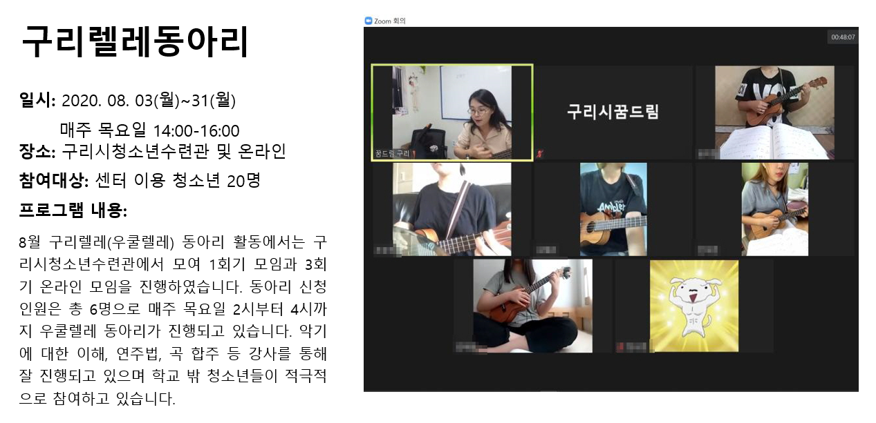 청소년상담복지센터 2020년 8월 구리렐레동아리 작성자 관리자 등록일자 2020년 9월 3일 11시 19분 20초 조회 294 1599099560_photo_table.png [ Size : 472.5KB , Down : 124 ] 미리보기 다운로드 목록보기