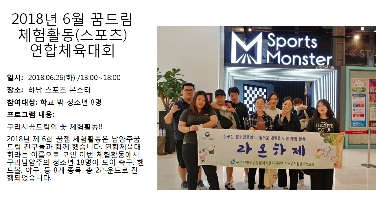 청소년상담복지센터 2018년 6월 체험활동(스포츠) 연합체육대회 작성자 관리자 등록일자 2018년 7월 3일 14시 2분 10초 조회 427 1530594130_photo_table.png [ Size : 937.37KB , Down : 103 ] 미리보기 다운로드 목록보기