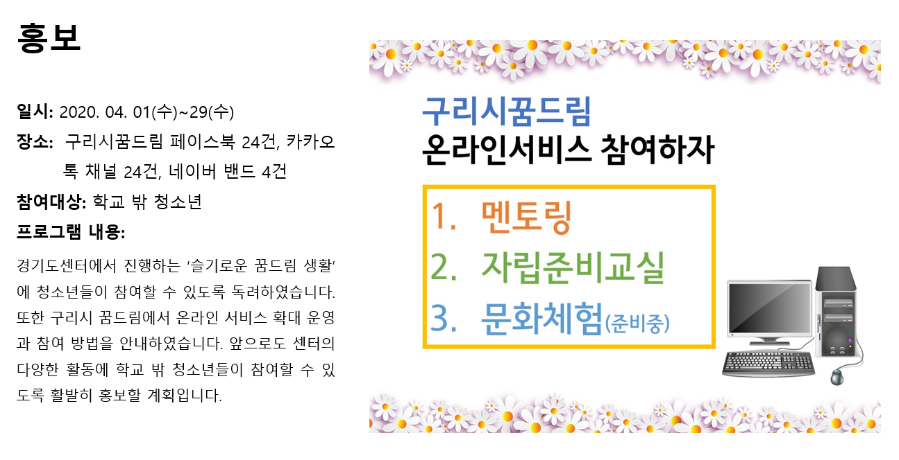청소년상담복지센터 2020년 4월 홍보 작성자 관리자 등록일자 2020년 5월 7일 10시 51분 6초 조회 295 1588816266_photo_table.png [ Size : 353.4KB , Down : 115 ] 미리보기 다운로드 목록보기