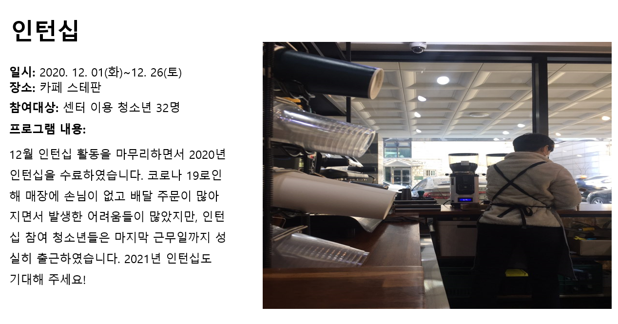 청소년상담복지센터 2020년 12월 인턴십 작성자 관리자 등록일자 2021년 1월 7일 9시 24분 1초 조회 405 1609979041_photo_table.png [ Size : 718.06KB , Down : 136 ] 미리보기 다운로드 목록보기