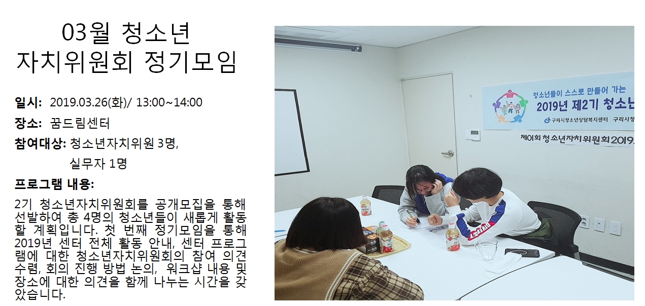 청소년상담복지센터 2019년 3월 청소년자치위원회 정기모임 작성자 관리자 등록일자 2019년 4월 4일 11시 2분 41초 조회 287 1554343361_photo_table.jpg [ Size : 454.6KB , Down : 107 ] 미리보기 다운로드 목록보기