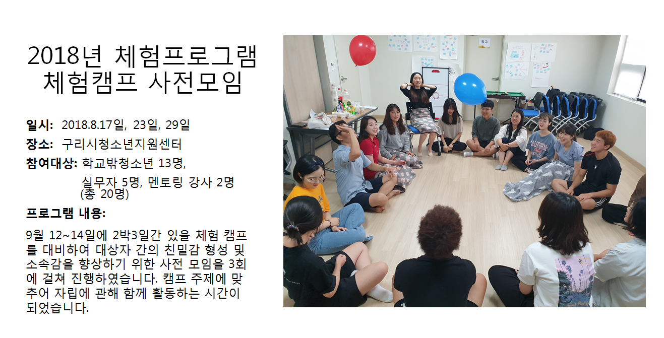 청소년상담복지센터 2018년 체험프로그램 체험캠프 사전모임 작성자 관리자 등록일자 2018년 9월 5일 10시 38분 4초 조회 302 1536111484_photo_table.png [ Size : 848.98KB , Down : 109 ] 미리보기 다운로드 목록보기