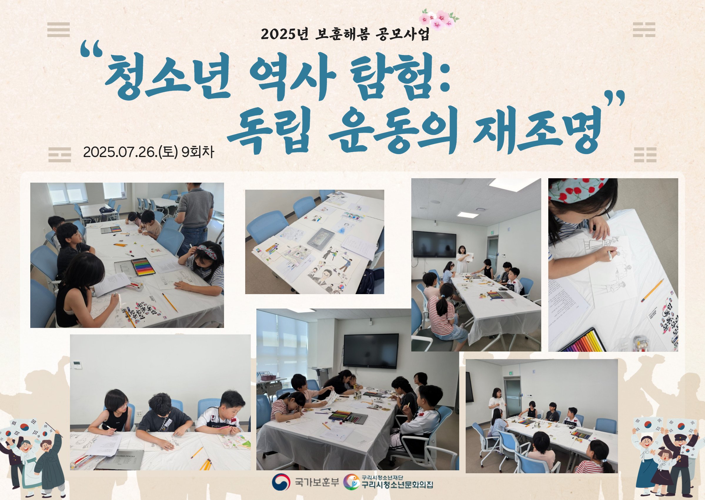 청소년문화의집 보훈부 공모사업 '청소년 역사탐험' 초등부 1기 - 9회차(2025.07.26) 작성자 김윤지 등록일자 2025년 7월 27일 12시 54분 33초 조회 73 국가보훈부 공모사업 '청소년 역사탐험: 독립 운동의 재조명'초등부 1기 9회차 - 일러스트 작업Ⅱ(10시~12시 총 2시간) 활동기록(공모사업) (2).jpg [ Size : 3.16MB , Down : 27 ] 미리보기 다운로드 목록보기