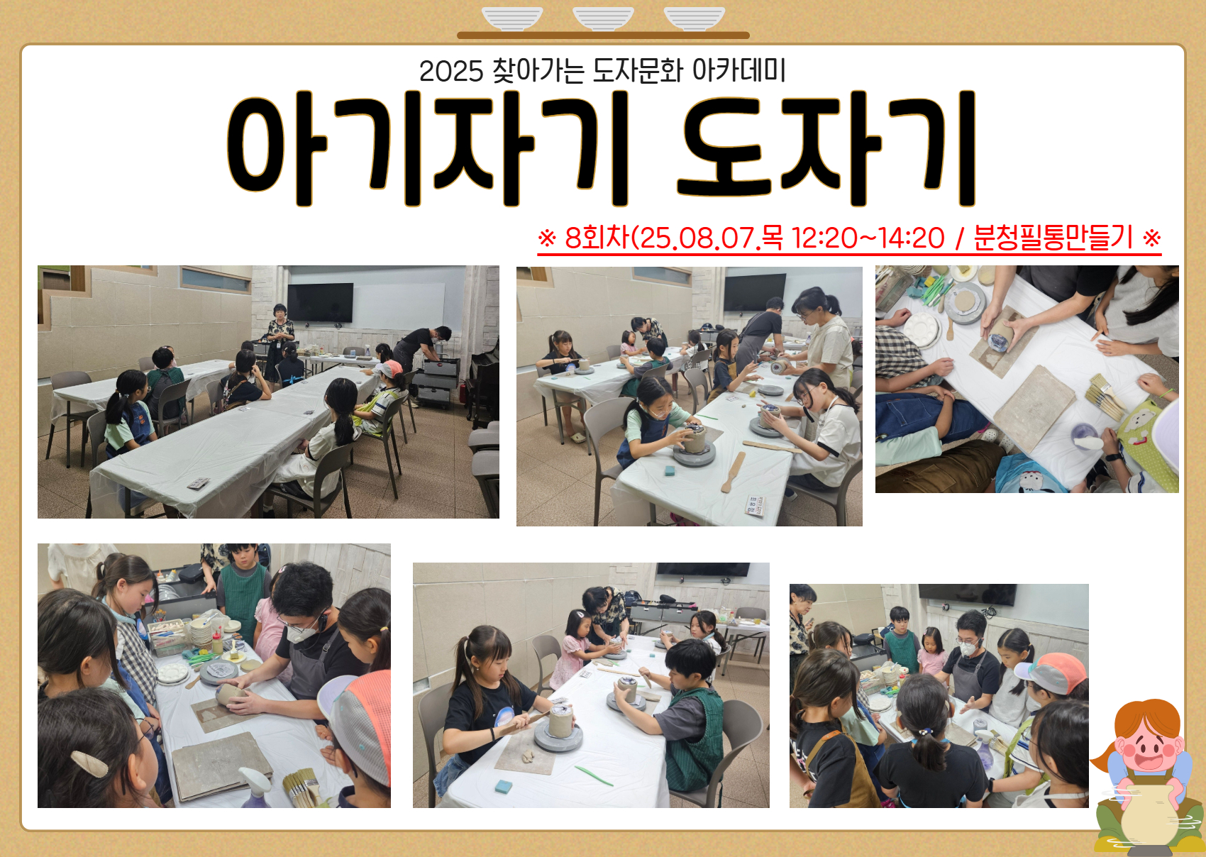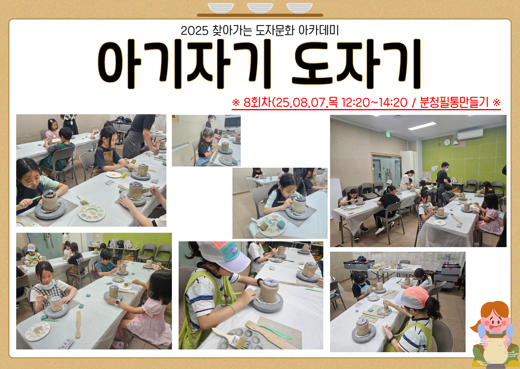 청소년문화의집 2025년 아기자기 도자기 8회차-분청 필통 만들기(25.08.07) 작성자 김윤지 등록일자 2025년 8월 7일 15시 55분 28초 조회 86 아기자기 도자기 활동기록 19.jpg [ Size : 1.63MB , Down : 35 ] 미리보기 다운로드 아기자기 도자기 활동기록 20.jpg [ Size : 1.65MB , Down : 38 ] 미리보기 다운로드 목록보기